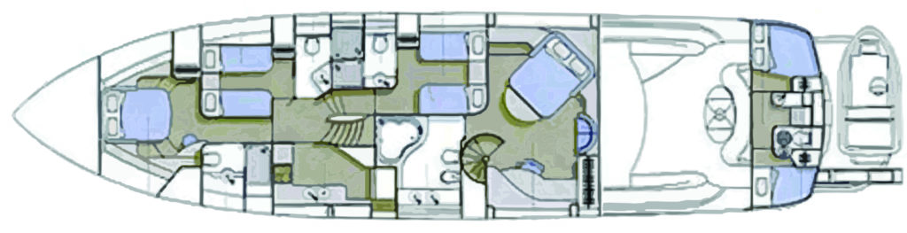 | Accommodation The Manhattan 84 offers comfortable accommodation for 8 Guests in 4 cabins with the addition of two crew cabins at the transom. The Master cabin is located amidships with full beam comfort and its own entrance from the saloon for extra privacy and spacious ensuite facilities including a hot tub bath. The Guest VIP cabin is located forward with ensuite facilities to port. The third & fourth guest cabins are located to starboard and both benefit from their own ensuite. The galley is located to starboard on the lower level and offers plenty of room to cater for all on board. On the main deck is a spacious saloon area aft as you come in through the sliding doors and comfortable seating opposite. The upper saloon has a dining table to starboard with the lower helm forward of this area a bar on the port side close the stairs to the flybridge ideally situated on the port side next to the dubbleside AV area. |